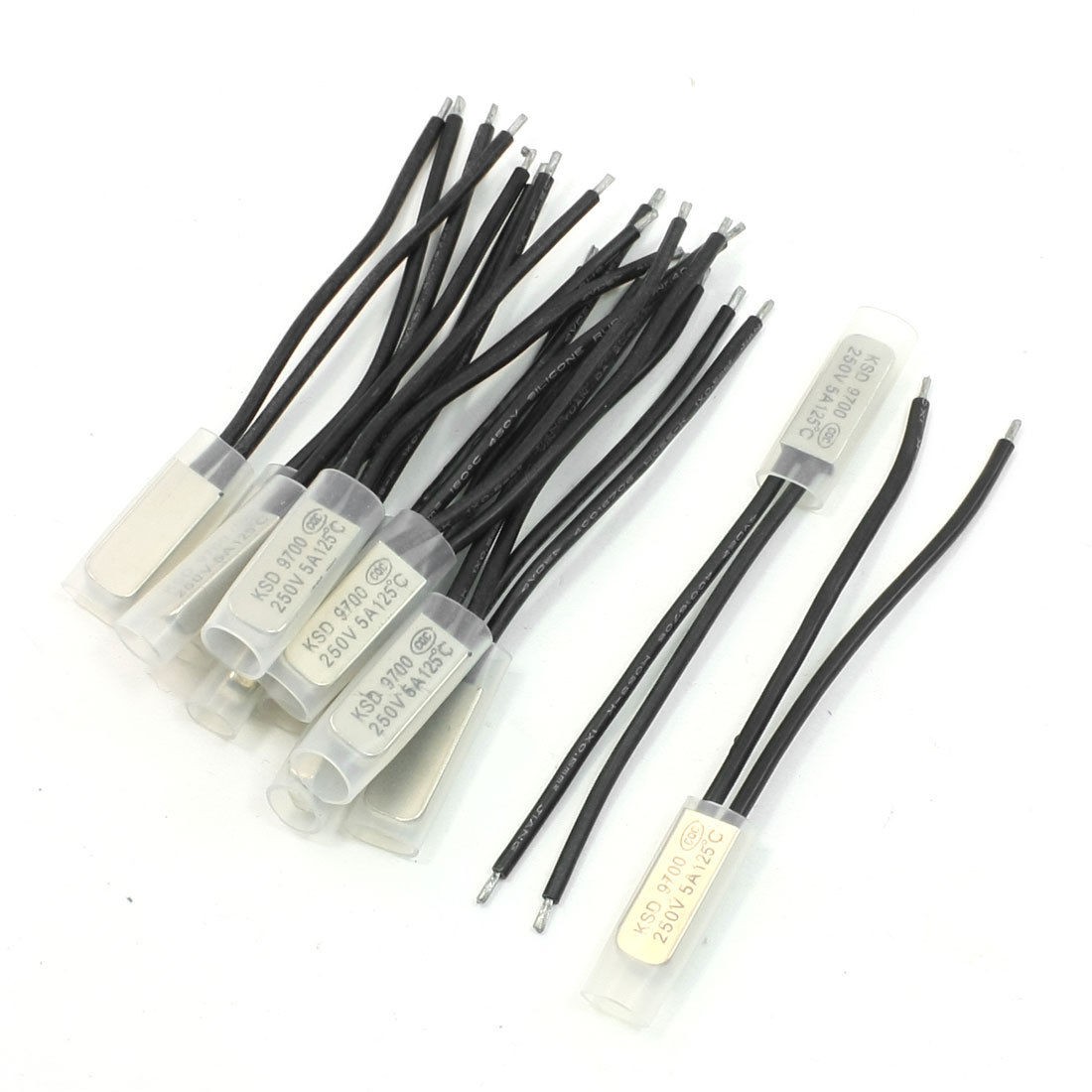 Rated Power 250V 5A Active Temperature 125°C Lead Wire Length 7.3cm / 2.9" Head Dimension 20 x 7.5 x 3.5mm/0.78" x 0.3" x 0.14"(L*W*T) Material Bimetal ,Plastic,Stainless Steel Main Color Silver Tone, Black Net Weight 40g Package Content 12PCS x Temperature Control Switch - Reviews