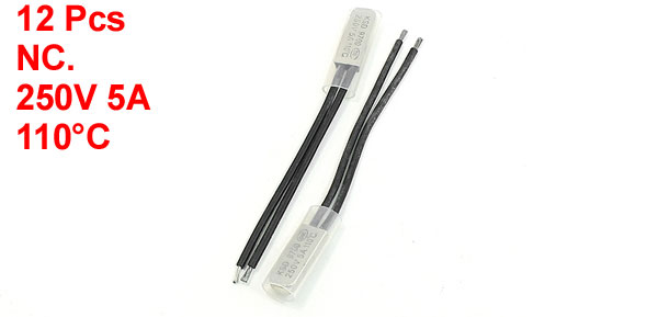 Rated Power 250V 5A Active Temperature 110°C Lead Wire Length 7.3cm / 2.9" Head Dimension 20 x 7.5 x 3.5mm/0.78" x 0.3" x 0.14"(L*W*T) Material Bimetal ,Plastic,Stainless Steel Main Color Silver Tone, Black Net Weight 41g Package Content 12 PCS x Temperature Control Switch - Reviews