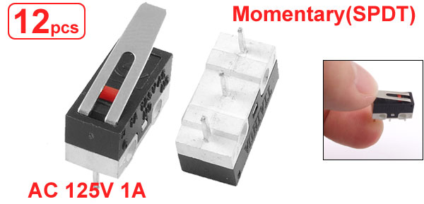 Product Name Micro Switch Voltage & Current AC 125V 1A Poles SPDT Contact Type 1NO + 1NC Action Type Momentary Actuator Type Lever Arm Terminal Type 3-Pin Terminals Overall Size 12.5 x 5.5 x 10mm / 0.49" x 0.22" x 0.39" (L*W*H) Mounting Hole Dia. 2mm / 0.08" Mounting Hole Spacing 6.5mm / 0.26" Pin Pitch 5mm / 0.2" Lever Arm Size 14 x 4mm / 0.55" x 0.16" (L*Max.W) Material Plastic, Metal Color Black, White, Red, Silver Tone Total Weight 8g Package Content 12 x Micro Switches - Reviews