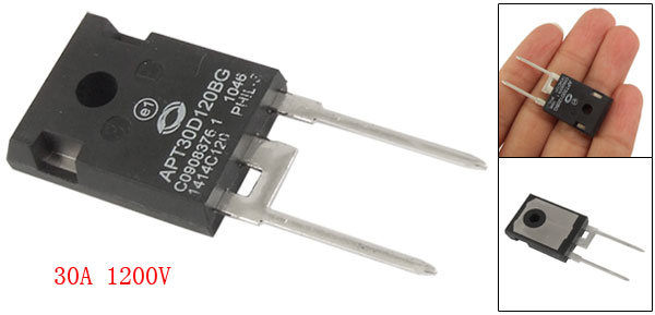 Product Name Rectifier Diode Model No. APT30D120BG Drain Source Voltage 1200V Drain Current 30A Mounting Hole Diameter 3.5mm / 0.138" Pin Size 22 x 9.5mm / 0.87" x 0.37" ( L* Pitch) Total Size 42 x 16 x 5mm / 1.65" x 0.63" x 0.2" (L*W*H) Weight 6.8g Package 1 x Rectifier Diode - Reviews