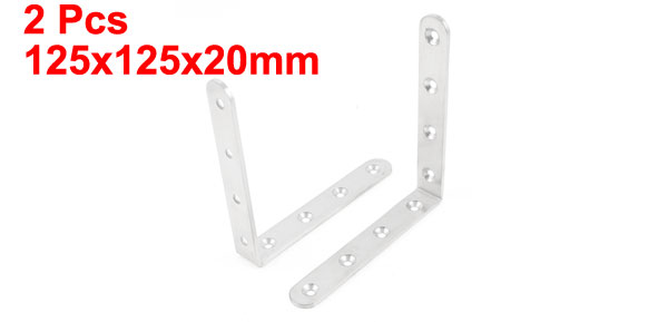 Product Name Angle Bracket Material Stainless Steel Color Silver Tone Hole Quantity 8 Holes Bracket Size 125 x 125 x 20mm/4.9" x 4.9" x 0.8"(L*W*T) Hole Dia. 6mm / 0.24" Net Weight 203g Package Content 2 x Angle Bracket - Reviews