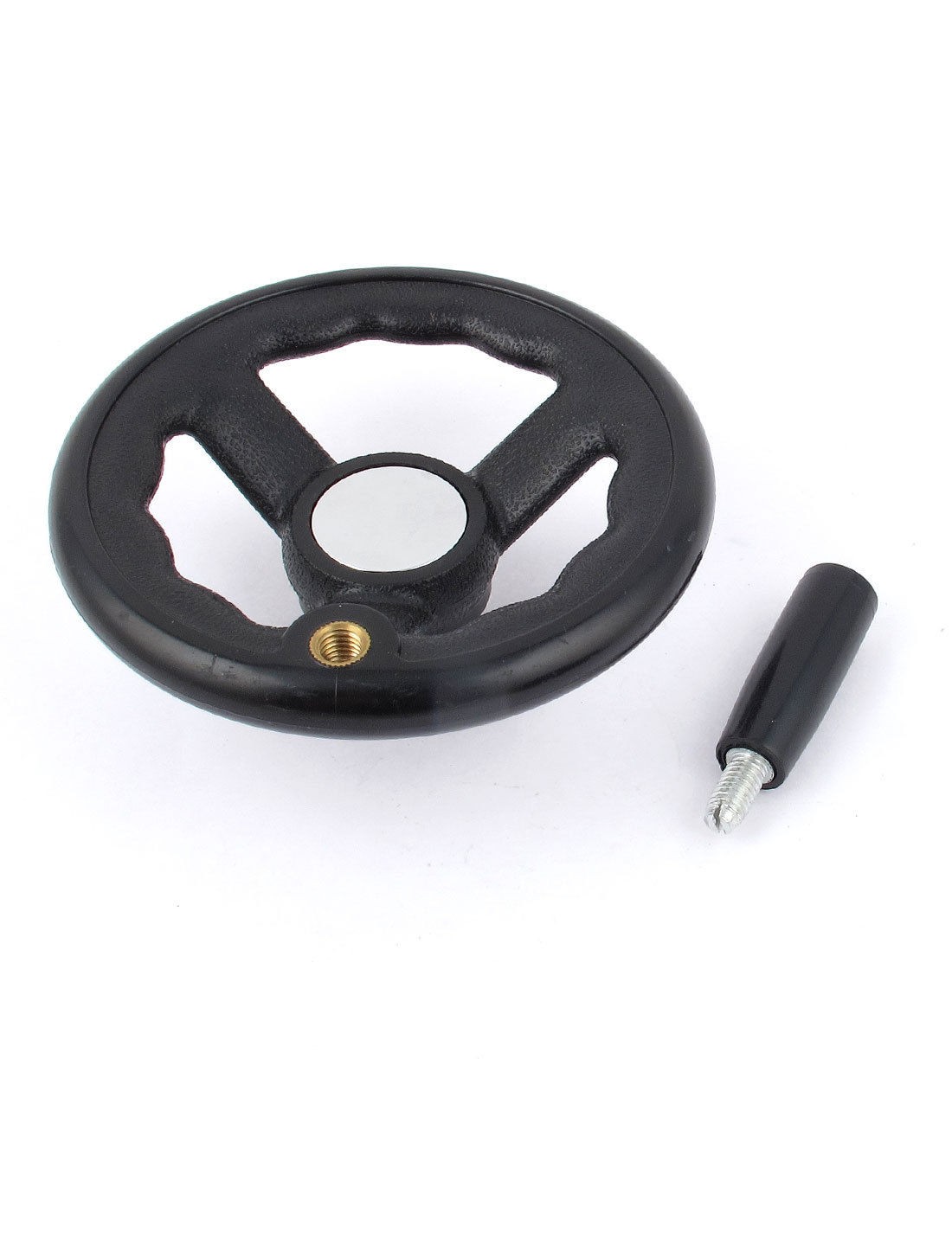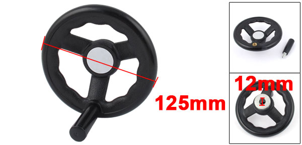 Product Name Handwheel Spoke 3 Wheel Diameter 125mm /5" Pilot Bore Diameter 12mm/0.47" Wheel Total Height(Not Included Handle) 48mm/1.9" Handle Size(Not Included Screw) 17 x 50mm/0.67" x 2"(D*L) Handle Thread Size M8 x 15mm/0.3" x 0.6"(D*L) Side Hole Dia M8/0.3" Thickness (Approx.) 15mm / 0.6" Materials Bakelite, Metal Net Weight 238g Package Content 1 x Handwheel
