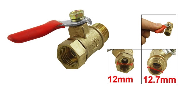 Product Name Ball Valve Female Thread Dia 12mm/ 0.47" Male Thread Dia 12.7mm/ 0.5" Thread Size 1/4"PT Level Handle Size 50 x 11mm/ 2" x 0.43" (L*W) Total Size(Excluded Handle) 34 x 15mm/ 1.4" x 0.6" (L*D) Color Brass Tone & Red Material Solid Brass Weight 31g Package 1 x Ball Valve - Reviews