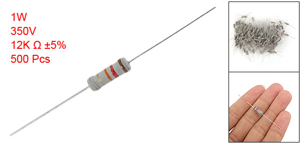 Details12K ohm 1W Watt 5% Axial Carbon Film Resistors 500 Pcs  Product Name Carbon Film Resistor Material Type Carbon Film Rated Power 1W Resistance Value 12K ohm Tolerance ±5% Withstand Voltage 350V Body Size (Approx.) 10.7 x 3.5mm /0.42" x 0.14" (L*Dia.) Lead Size (Each End) 23 x 0.4mm/0.9" x 0.016" (L*Dia.) Color As Picture Shown Weight 157g Package Content 500 Pcs(±2%) x Carbon Film Resistors