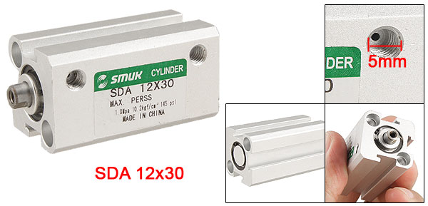 Product Name Thin Air Cylinder Model No. SDA 12x30 Motion Type Double Action Bore 12mm Stroke 30mm Max Working Pressure 1.0Mpa Ensured Pressure Resistance 10.2kgf/cm2 Piston Rod External Diameter 6mm/ 0.24" Inlet / Outlet Thread Diameter 5mm/ 0.2" Mounting Thread Diameter 4.2mm/ 0.165" Working Medium Pass Filtered & Lubricator Compress Air Main Material Aluminum Alloy Color Silver Tone Size 25 x 25 x 52mm/ 1" x 1" x 2" (L*W*H) Net Weight 59g Package Content 1 x Thin Air Cylinder - Reviews