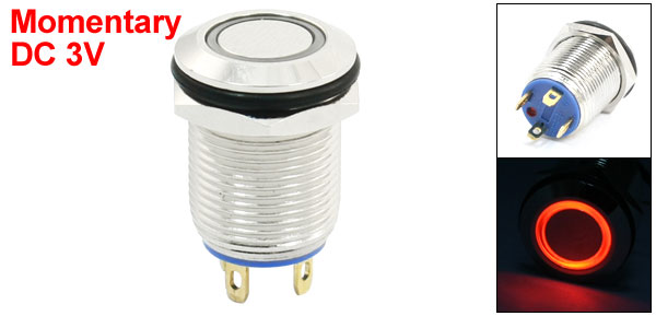 Product Name Push Button Switch Contact Type Momentary Action Type SPST Lamp Voltage DC 3V Light Color Red Rated Voltage & Current AC 250V 2A Pin Quantity 4 Thread Diameter 12mm/0.47" Overall Size(Approx.) 14 x 21mm / 0.55" x 0.83"(Max.Diameter*Height) Main Color Silver Tone Material Metal, Plastic Weight 6g Package Content 1 x Push Button Switch - Reviews