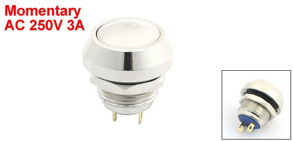 Item Name Push Button Switch Action Type Momentary Head Shape Round Head Contact SPST(ON/OFF) Switch Rating 250VAC 3A Pin Number 2 Thread Diameter 12mm/0.5" Total Size 21 x 18mm/0.83" x 0.7" (L*Max.W) Material Plastic, Metal Color Silver Tone Weight 10g Package Content 1 x Push Button Switch - Reviews