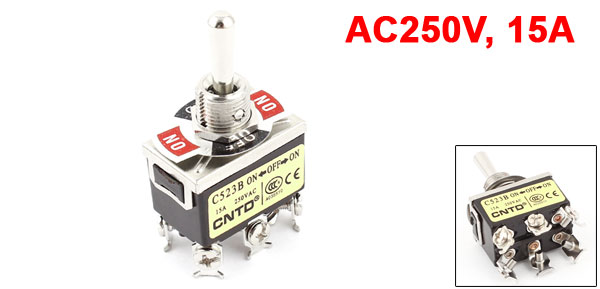 Product Name Toggle Switch Model C523B Type DPDT(Latching) Position 3 Positions(ON/OFF/ON) Voltage & Current AC250V, 15A Mounting Thread Diameter 12mm/ 0.47" Body Size 34 x 20 x 22mm / 1.3" x 0.8" x 0.87"(L*W*H) Total Height 60mm/ 2.4" Material Metal, Plastic Color Black, Silver Tone Weight 38g Package Content 1 x Toggle Switch - Reviews
