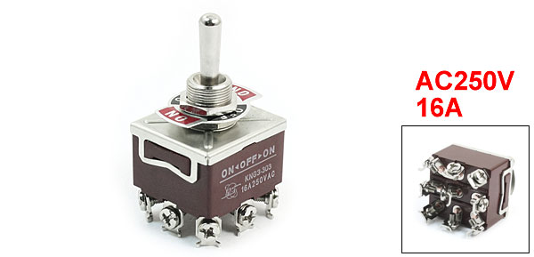 Product Name Toggle Switch Model KNG3-303 Type 3PDT(Latching) Position 3 Positions (ON/OFF/ON) Mounting Hole Diamter 12mm / 0.47" Voltage & Current AC250V, 16A Main Body Size 33 x 29 x 20mm / 1.3" x 1.1" x 0.8"(L*W*H) Overall Height 60mm / 2.4" Material Metal & Resin, Plastic Color As Picture Shown Weight 53g Package Content 1 x Toggle Switch - Reviews
