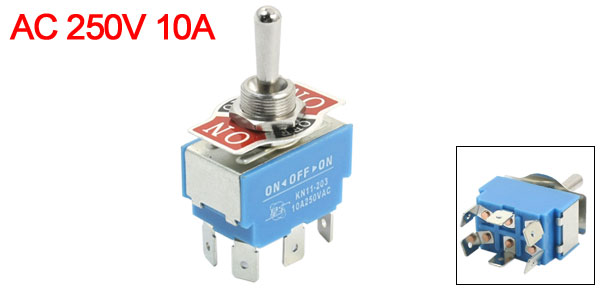 Product Name Toggle Switch Model KN11-203 Type DPDT (Latching) Position 3 Positions (ON/OFF/ON) Voltage, Current AC 250V 10A Mounting Thread Diameter 12 mm / 0.47" Main Body Size 3.3 x 2 x 2 cm / 1.3" x 0.8" x 0.8" (L*W*H) Overall Height 6cm / 2.4" Color Blue Net Weight 40g Package Content 1 x Toggle Switch - Reviews