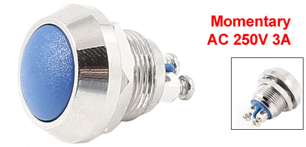 Item Name Push Button Switch Action Type Momentary Head Shape Round Head Contact SPST(ON/OFF) Switch Rating AC 250V 3A Pin Number 2 Thread Diameter(Mounting Hole Size) 12mm/ 0.47" Total Size 23 x 18mm/ 0.9" x 0.7" (L*Max.W) Main Material Stainless Steel Color Silver Tone, Blue Weight 14g Package Content 1 x Push Button Switch - Reviews