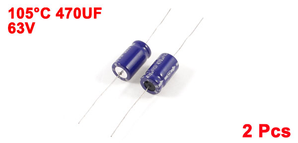 Details12mm x 22mm 63V 470UF 105C Axial Electrolytic Capacitor 2 Pieces  Product Name Electrolytic Capacitor Type Axial Lead Features Standard General Purpose Maximum Temperature 105°C Withstand Voltage 63V Capacitance 470UF Body Size 12 x 22mm / 0.5'' x 0.9'' (D*L) Lead Length 36mm/ 1.3'',40mm/ 1.6'' Dielectric Material Aluminum Weight 10g Color As Picture Shown Package Content 2 Pcs x Electrolytic Capacitors
