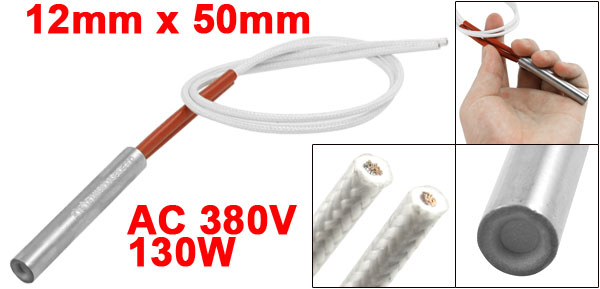 Product Name Cartridge Heater Material Stainless Steel, PVC, Nylon Rated Voltage AC 380V Power 130W Heater Size (Approx.) 12 x 50mm / 0.47" x 1.97" (D * L ) Wire Length (Approx.) 33cm / 13" Color Silver Tone, Red, White Weight 26g Package Content 1 x Cartridge Heater - Reviews