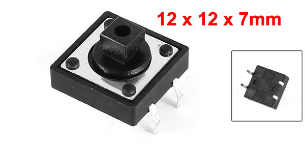 Product Name Tact Switch Type SPDT Contact Type Momentary Contact Dimension 12 x 12 x 7mm / 0.47"x 0.47"x 0.28"(L*W*H) Pin Pitch 13 x 4mm / 0.51" x 0.16" (L*W) Pin Length 4mm/0.16" Material Plastic, Metal, Electric Parts Color Black, Silver Tone Net Weight 1g Package Content 1 x Tact Switch - Reviews