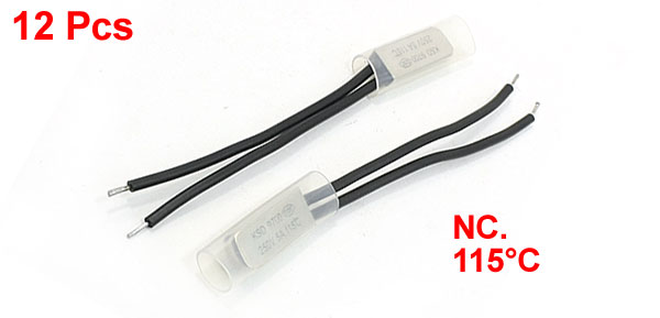Rated Power 250V 5A Active Temperature 115°C Lead Wire Length 7.3cm / 2.9" Head Dimension 20 x 7.5 x 3.5mm/0.78" x 0.3" x 0.14"(L*W*T) Material Bimetal ,Plastic,Stainless Steel Main Color Silver Tone, Black Net Weight 43g Package Content 12 PCS x Temperature Control Switch - Reviews