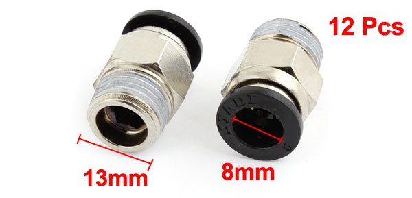 Item Name Quick Fittings Material Metal, Plastic Color Silver Tone, Black Thread Size 1/4" PT Thread Diameter 13mm Inner Diameter (Black End) 8mm/ 0.315" Total Size(Each) 23 x 14mm/ 0.91" x 0.55" (L*Max. D) Weight 125g Package Content 12 x Quick Fittings - Reviews