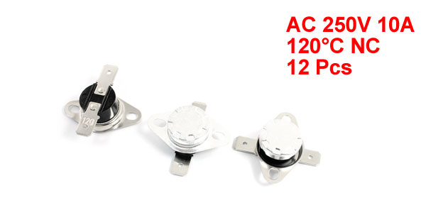 Product Name Temperature Control Switch Model.No KSD301 Action Type Normally Closed(NC) Action Temperature 120°C Voltage & Current AC 250V, 10A Total Size (Each) 34 x 18 x 12mm / 1.3" x 0.71" x 0.47"(L*W*H) Mounting Hole Size 4.5 x 3.5mm/0.18" x 0.14"(L*W) Material Metal, Plastic Color Black, Silver Tone Total Weight 56g Package Content 12 x Temperature Control Switches - Reviews