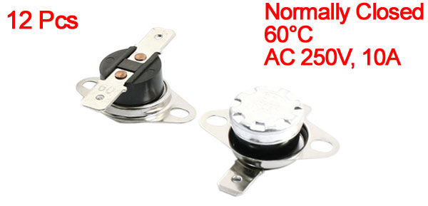 Product Name Temperature Control Switch Model.No KSD301 Action Type Normally Closed(NC) Action Temperature 60°C Voltage & Current AC 250V, 10A Total Size (Each) 34 x 18 x 12mm / 1.3" x 0.71" x 0.47"(L*W*H) Mounting Hole Size 4.5 x 3.5mm/0.18" x 0.14"(L*W) Material Metal, Plastic Color Black, Silver Tone Total Weight 59g Package Content 12 x Temperature Control Switches - Reviews