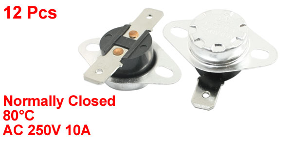 Product Name Temperature Control Switch Model.No KSD301 Action Type Normally Closed(NC) Action Temperature 80°C Voltage & Current AC 250V, 10A Total Size (Each) 34 x 18 x 12mm / 1.3" x 0.71" x 0.47"(L*W*H) Mounting Hole Size 4.5 x 3.5mm/0.18" x 0.14"(L*W) Material Metal, Plastic Color Black, Silver Tone Total Weight 54g Package Content 12 x Temperature Control Switches - Reviews
