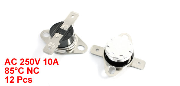 Product Name Temperature Control Switch Model.No KSD301 Action Type Normally Closed(NC) Action Temperature 85°C Voltage & Current AC 250V, 10A Total Size (Each) 34 x 18 x 12mm / 1.3" x 0.71" x 0.47"(L*W*H) Mounting Hole Size 4.5 x 3.5mm/0.18" x 0.14"(L*W) Material Metal, Plastic Color Black, Silver Tone Total Weight 55g Package Content 12 x Temperature Control Switches - Reviews