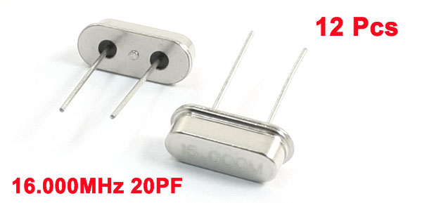 Product Name Crystal Oscillator Output Frequency 16.000MHz Package Type HC-49S Frequency Tolerance ±20ppm Load Capacitance 20PF Mounting Type DIP Effective Series Resistance 30ohm Pins Number 2 Color Silver Tone Each Size 16 x 11 x 4.3mm/ 0.63" x 0.43" x 0.17"(H*L*W) Weight 7g Package Content 12 x Crystal Oscillators - Reviews