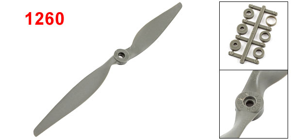 Details12"x6" Gray Plastic Electric RC Aircraft Airplane Prop w Motor Shaft Adapter  Product Name Electric Propeller Blade Number 2 Model 1260(Non-OEM) Motor Shaft Hole Dia 5.5mm / 0.22" Total Length(Rotating Diameter) 305mm /12" Pitch 152mm/6" Max Thickness 7.5mm / 0.3" Motor Shaft Adapter Hole Dia 3mm, 3.2mm, 4mm, 5mm,6mm,7.95mm Material Plastic Color Gray Weight 30g Package Content 1 x Electric Propeller