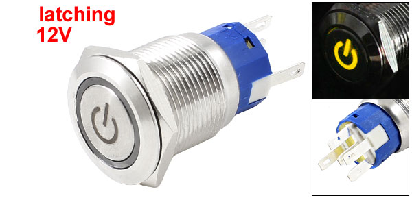 Item Name Push Button Switch Action Type latching Type Head Shape Round Flat Head Contact SPDT(1NO 1NC 1Com ) Switch Rating AC 250V 5A Lamp Color Yellow Lamp Voltage 12V Pin Number 5 Thread Diameter 19mm/0.75" Total Size 40 x 25mm/1.6" x 1"(L*Max.W) Material Stainless Steel, Plastic, Electric Parts Housing Color Silver Tone Weight 17g Package Content 1 x Push Button Switch - Reviews