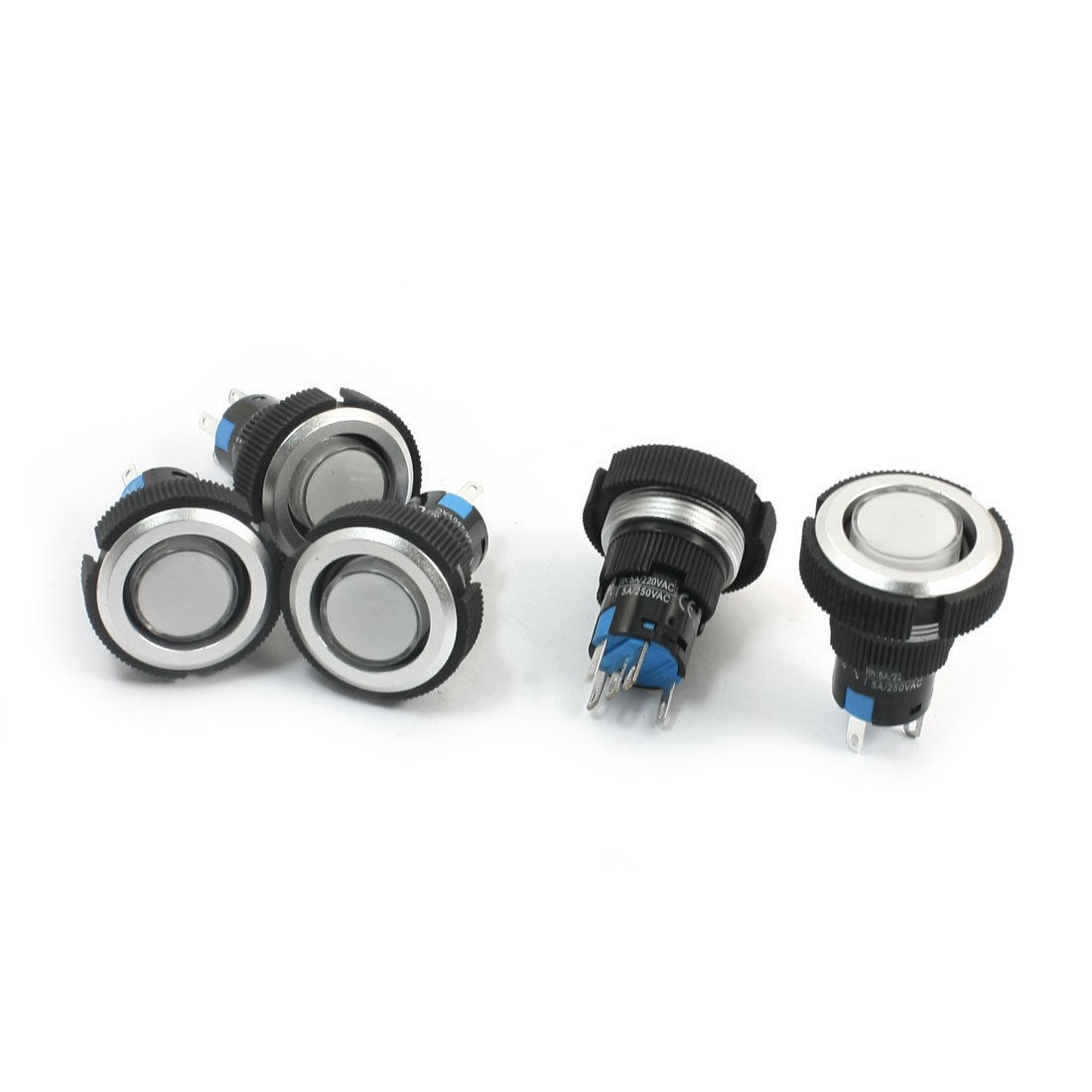 Item Name Push Button Switch Action Type Momentary Type Contact SPDT(1NO 1NC) Switch Rating AC 220V 5A Lamp Voltage 12V Lamp Color Warm White Pin Number 5 Thread Diameter 22mm/0.87'' Total Size(Not Included Pin) 29 x 32mm/1.2'' x 1.3'' (L*Max.W) Material Plastic, Electric Parts Housing Color Black, White Net Weight 57g Package Content 5Pcs x Push Button Switch - Reviews