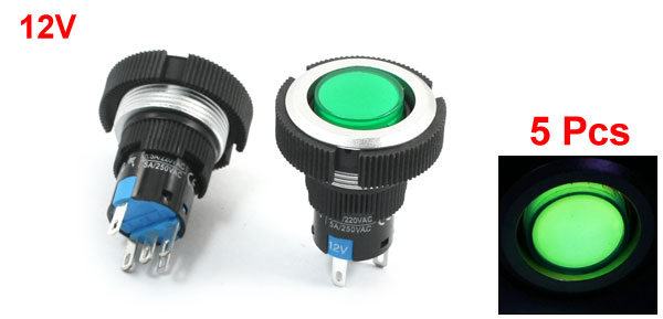 12V 22mm Thread SPDT 5Pin Soldering Locking Green Lamp Pushbutton Switch 5 Pcs