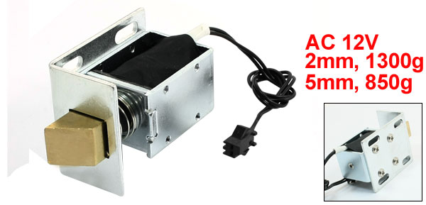 Product Name Door Solenoid Material Metal, Electronic Parts Color Silver Tone Rated Voltage AC 12V Rated Stroke & Force 2mm, 1300g/2.9lb