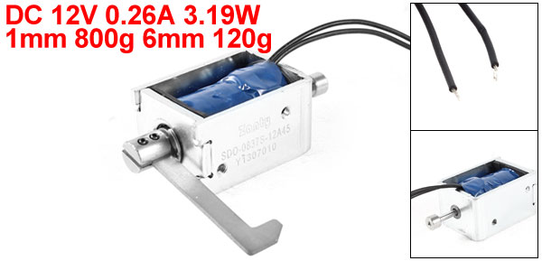Product Name Solenoid Electromagnet Rated Voltage 12V 3.19W Rated Current 0.26A Force& Stroke 1mm 800g / 6mm 120g Type Pull Push Power Cable Type 2 Pin Connector Body Size 37 x 25 x 20mm/ 1.5" x 1" x 0.8"(L*W*H) Cable Length 68cm/26.8" Material Metal, Electronic Parts Color Silver Tone, Blue Weight 94g Package Content 1 x Solenoid Electromagnet - Reviews