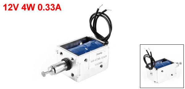 Product Name Solenoid Electromagnet Rated Voltage 12V 4W Rated Current 0.33A Force& Stroke 1mm 210g / 6mm 30g Type Pull Power Cable Type 2 Pin Connector Body Size 24 x 20 x 30mm/ 0.9" x 0.8" x 1.2"(L*W*H) Plunger Bar Size 30 x 7mm/1.2" x 0.27"(L*D) Mounted Hole Dia 2.5mm Cable Length 9cm/3.5" Material Metal, Electronic Parts Color Silver Tone, Blue Weight 61g Package Content 1 x Solenoid Electromagnet - Reviews
