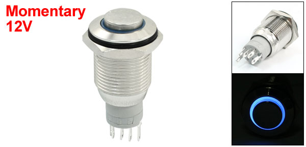 Item Name Push Button Switch Action Type Momentary Type Head Shape Round Flat Head LED Type Ring-Illuminated LED Contact SPDT(1NO 1NC 1Com ) Switch Rating 250VAC 3A LED Color Blue Lamp Voltage 12V Pin Number 5 Thread Diameter 16mm/0.63" Total Size 38 x 19mm/1.5" x 0.75"(L*Max.W) Material Stainless Steel, Plastic, Electric Parts Housing Color Silver Tone Weight 15g Package Content 1 x Push Button Switch - Reviews