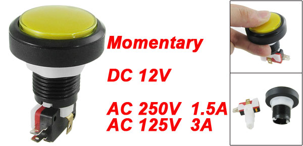 Product Name Push Button Switch Contact Type Momentary Action Type 1 NO, 1 NC Light Voltage DC 12V Light Source LED Light Color Yellow Rated Voltage & Current AC 250V, 1.5A AC 125V, 3A Pin Quantity 5 Button Diameter 36mm/1.4" Thread Diameter 24mm/0.94" Overall Size(Approx.) 45.5 x 68mm/1.8" x 2.7"(Max.Diameter*Height) Color Yellow, Black Material Plastic, Electronic Parts Weight 38g Package Content 1 x Push Button Switch - Reviews