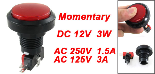 Product Name Push Button Switch Contact Type Momentary Action Type 1 NO, 1 NC Light Voltage DC 12V, 3W Light Color Red Rated Voltage & Current AC 250V, 1.5A AC 125V, 3A Pin Quantity 5 Button Diameter 36mm/1.4" Thread Diameter 24mm/0.94" Overall Size(Approx.) 45.5 x 68mm/1.8" x 2.7"(Max.Diameter*Height) Color Red, Black Material Plastic, Electronic Parts Weight 37g Package Content 1 x Push Button Switch - Reviews