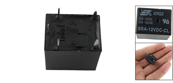 Product Name Power Relay Model No. SRA-12VDC-CL Coil DC 12V Rated Load 20A, 14VDC/125VAC Size 1.5cm/0.59" x 1.1cm/0.43" x 1.7cm/0.67" (L*W*H) Material Hard Plastic Color Black