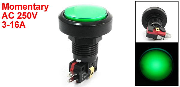 Product Name Mushroom Push Button Switch Model SV-16-1C25 Action Type Momentary Contact Type SPDT(1NO+1NC) Rating AC 250V 3-16A Light Voltage 12V Terminals 3 Pin Button Diameter 38mm / 15" Mounting Thread Diameter 23mm / 0.91" Total Size 66 x 47 x56mm /2.6" x 1.9" x 1.8"(L*W*H) Light Color Green Shell Color Green, Black Material Plastic, Electric Parts Net Weight 32g Package Content 1 x Mushroom Push Button Switch  - Reviews