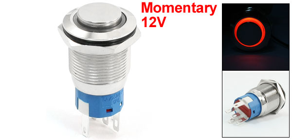 Item Name Push Button Switch Action Type Momentary Type Head Shape Round Head LED Type Ring-Illuminated LED Contact SPDT(1NO 1NC 1Com ) Switch Rating 250VAC 5A LED Color Red Lamp Voltage 12V Pin Number 5 Thread Diameter 19mm/0.75" Total Size 42 x 22mm/1.7" x 0.87" (L*Max.W) Material Stainless Steel, Plastic, Electric Parts Housing Color Silver Tone Weight 18g Package Content 1 x Push Button Switch - Reviews