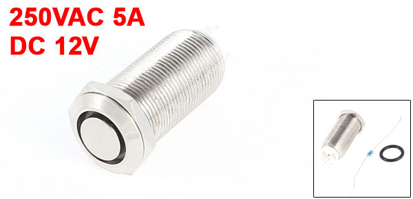 Item Name Push Button Switch Action Type Latching Type LED Type Ring-Illuminated LED Head Shape Flat Head Contact SPST Switch Rating 250VAC 5A Lamp Voltage DC 12V LED Color Red Pin Number 4 Thread Diameter 12mm/0.47" Total Size 34 x 14mm/1.3" x 0.55" (L*Max.W) Material Stainless Steel, Plastic, Electric Parts Housing Color Silver Tone Net Weight 6g Package Content 1 x Push Button Switch - Reviews