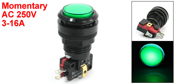 Product Name Mushroom Push Button Switch Model SV-16-1C25 Action Type Momentary Contact Type SPDT(1NO+1NC) Rating AC 250V 3-16A Light Voltage 12V Terminals 3 Pin Button Diameter 24mm /0.94" Mounting Thread Diameter 23mm / 0.91" Total Size 64 x 40 x 33mm /2.5" x 1.6" x 1.3"(L*W*H) Light Color Green Shell Color Green, Black Material Plastic, Electric Parts Net Weight 28g Package Content 1 x Mushroom Push Button Switch - Reviews