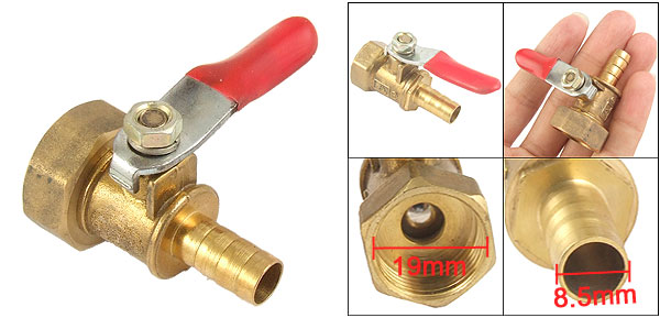 Product Name Ball Valve Thread Inner Diameter 19mm/13/16'' Ball Hole Diameter 6mm/1/4'' Hose Tail OD 8.5mm/0.33'' Level Handle Size 45 x 11mm/1.77'' x 0.43'' (L*W) Overall Size 58 x 24 x 33mm/2.3'' x 0.9'' x 1.3'' (L*W*H) Color Gold Tone & Red Material Brass & Metal Weight 36g Package 1 x Gas Ball Valve - Reviews