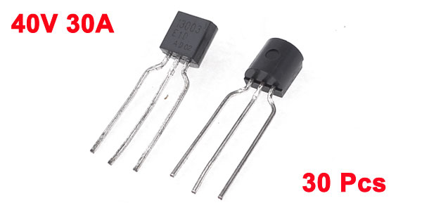 Details13003 NPN 40V 30Amp 3 Pin Semiconductor Transistor 30 Pcs  Product Name Transistor Model No. 13003 NPN Current 30A Maximum Reverse Voltage 40V Mounting Hole Diameter 3.1mm / 0.12" Pin Size 10 x 7mm / 0.39" x 0.28" ( L* Pitch) Total Size 20 x 15 x 5mm / 1.57" x 0.8" x 0.20" (L*W*H) Main Material Plastic, Metal Main Color Black, Silver Tone Weight 17g Package 30 x Transistor