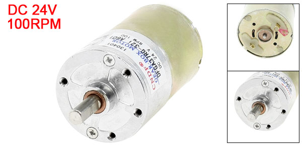 Product Name Gear Motor Rated Voltage DC 24V Rated Torque 13.14Kg.cm Rated Speed 100 RPM Shaft Size 15 x 6mm/0.6" x 0.24" (L*D) Motor Body Length 62mm/2.4" Motor Body Diameter 37mm/1.46" Thread Diameter 2.5mm/0.1" Total Length(Included Pin) 85mm/3.3" Pin Number 2 Pins Material Metal, Electronic Parts Color Gold Tone, Silver Tone Weight 191g Package Content 1 x Gear Motor - Reviews