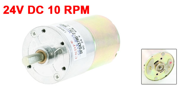 Product Name Gear Motor Rated Voltage DC 24V Rated Current 130mA Rated Torque 13.14Kg.cm Rated Speed 10 RPM Shaft Size 15 x 6mm/0.6" x 0.24" (L*D) Motor Body Length 62mm/2.4" Motor Body Diameter 37mm/1.46" Thread Diameter 2.5mm/0.1" Total Length(Included Pin) 85mm/3.3" Pin Number 2 Pins Material Metal, Electronic Parts Color Gold Tone, Silver Tone Weight 189g Package Content 1 x Gear Motor - Reviews