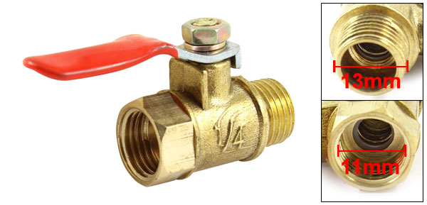 Product Name Ball Valve Material Metal Color Brass Tone, Yellow Inner Valve Hole Dia. 10mm/0.4" Thread Dia. 1/4" Female PT to 1/4" Male PT(13mm to 11mm) Level Handle Size 42 x 10mm/1.6" x 0.4’ (L*W) Overall Size 52 x 30 x 15mm/2” x 1.2“ x 0.6” (L*W*H) Net Weight 29g Package Contents 1 x Ball Valve - Reviews