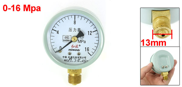 Product Name Compound Gauge Pressure Intensity 0-16Mpa Accuracy Class 2.5 (+/-2.5% fsd) Connector Type 13mm/ 1/4" PT Size 6 x 3.5cm/ 2.3" x 1.4" (D*T) Dial Color White Exterior Material Metal Net Weight 130g Package 1 x Compound Gauge - Reviews