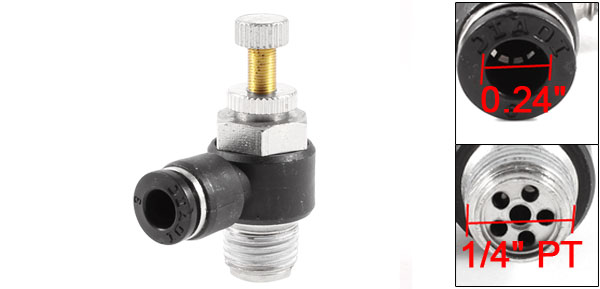 Product Name Pneumatic Speed Controller Fit Tube OD 6 mm / 0.24" Male Thread OD 13 mm / 1/4" PT Overall Size 4.4 x 3.5 x 1.8 cm / 1.7" x 1.4" x 0.7" (L*W*H) Material Plastic, Metal Color Black, Silver Tone Weight 34g Package Content 1 x Pneumatic Speed Controller - Reviews