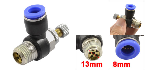 Product Name Speed Control Fitting Material Plastic, Metal Thread Diameter 13mm/ 0.51'' Inner Diameter (Blue End) 8mm/ 0.31'' Each Total Size 44 x 35 x 18mm/ 1.7'' x 1.4'' x 0.7'' (L*W*T) Color Black, Blue Weight 32g Package Content 1 x Speed Control Fitting - Reviews