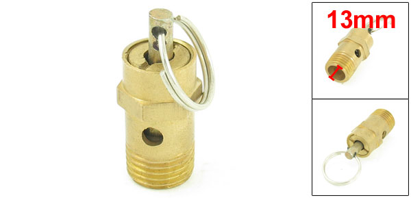 Details13mm Male Thread Brass Air Compressor Safety Pressure Relief Valve  Product Name Pressure Relief Valve Male Thread Diameter 13mm Thread Size 1/4" PT Overall Size 35 x 16mm/ 1.4" x 0.63" (L*D) Material Brass Color Gold Tone Weight 19g Package Content 1 x Pressure Relief Valve
