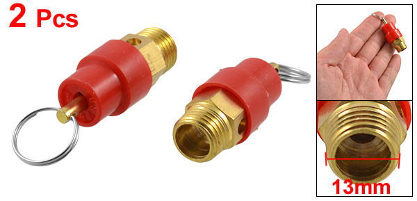 Product Name Pressure Relief Valve Material Plastic, Metal Color Brass Tone, Red Working Pressure 8 Kg (0.8MPa ) Thread Diameter 13mm / 0.52" Ring Inside Diameter 15mm / 0.59" Valve Total Size 57 x 17mm / 2.2" x 0.68" (L*Max.D) Weight 50g Package Content 2 x Pressure Relief Valve - Reviews